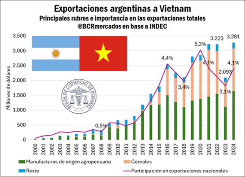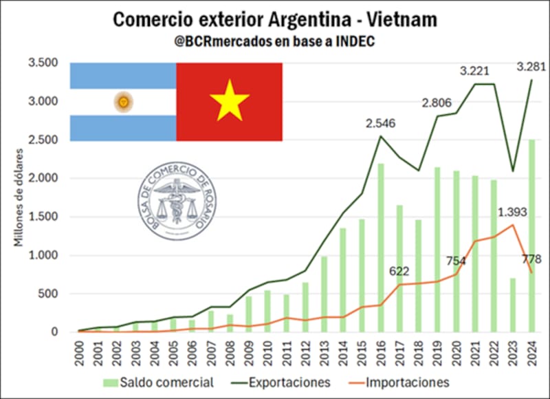 Y añade: "En 2024 se despacharon hacia Vietnam más de 11 millones de toneladas de productos agro, más del doble que en 2023 y un 36% por encima del promedio de los últimos tres años".