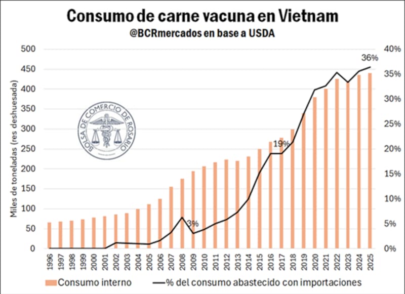 Este potencial en términos cárnicos, afirmaron, indica que más allá de los importantes incrementos productivos, que impulsarán las importaciones de harina de soja y maíz, también se vienen demandando importaciones crecientes de carnes hacia Vietnam.