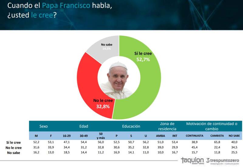 Pensando en otras figuras públicas, el Papa Francisco evidencia un alto nivel de credibilidad (52,7% de los consultados manifiestan creerle), asimismo el 52,6% dice creerle a Leo Messi. Por su parte, Marcelo Tinelli obtiene una nivel de credibilidad muy bajo, solo 23,5% sostiene creerle cuando habla, y Mirtha Legrand obtiene un nivel de credibilidad de 35,3%.