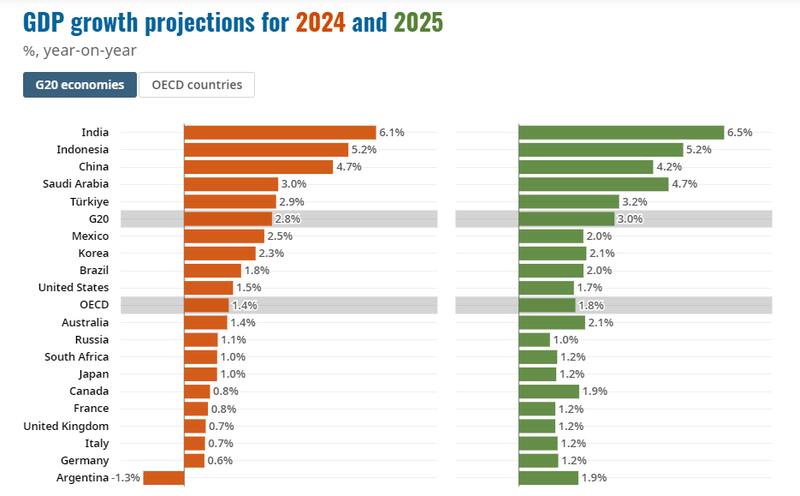 El escenario está marcado por los riesgos: una mayor devaluación, espiralización de la inflación y problemas de solvencia. "La necesidad de reducir el gasto público de forma rápida en medio de presiones sociales puede llevar a la inestabilidad política", advierte el grupo de naciones desarrolladas que evalúa la economía argentina como parte del G20. Entre los principales veinte países del mundo, es el único país que no crecerá en 2024.