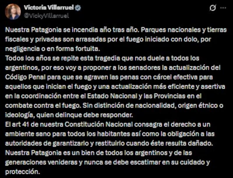 La vicepresidenta Victoria Villarruel planteó este lunes endurecer las penas a quienes inicien los incendios en la Patagonia y reclamó más recursos y una mejor coordinación entre Nación y las Provincias, en un mensaje que reaviva la tensión con Javier Milei. “Nunca se debe escatimar en su cuidado y protección”, aseguró.