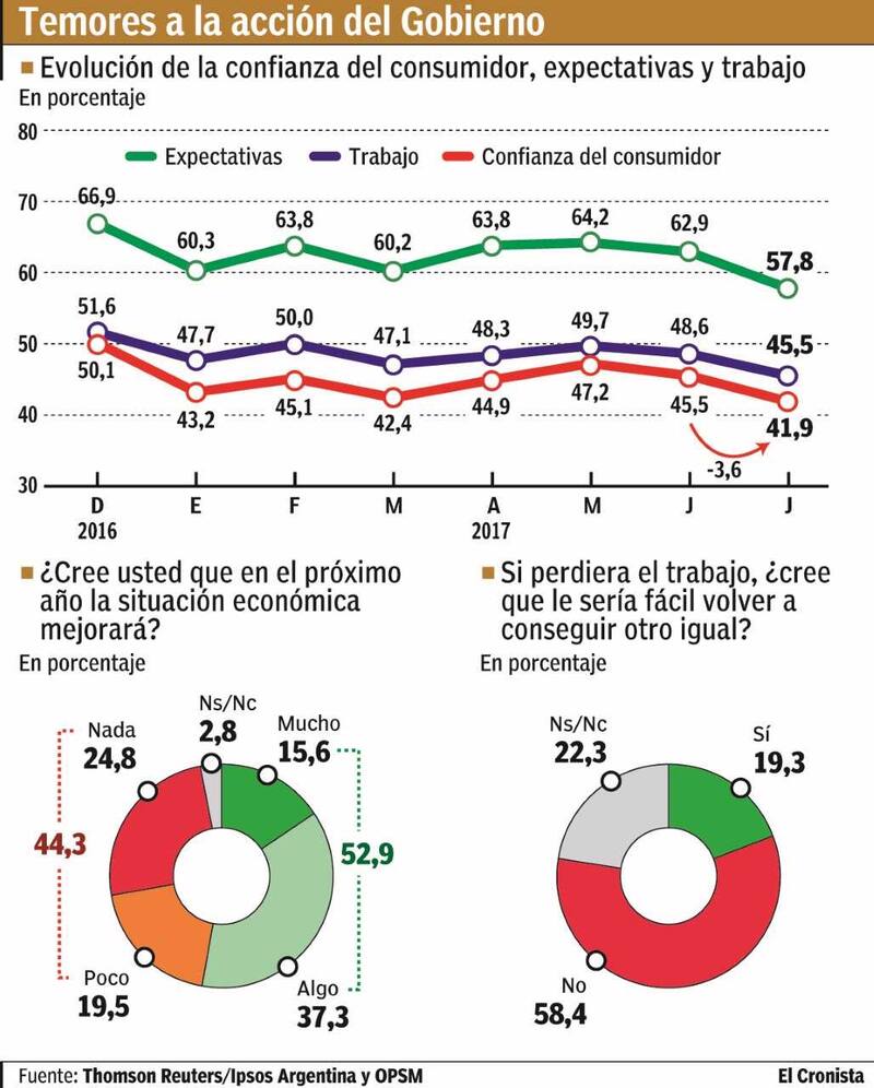 Descompuesto en cuatro categorías (situación financiera personal percibida; expectativas personales y sobre el país; clima de inversiones; y seguridad en el actual puesto de trabajo y perspectivas), destacan en el informe las caídas en Expectativas (5,1 puntos) y en el subíndice de Trabajo (3,1 puntos) En ambos casos, se trata de los registros más bajos del año. En el primer caso, el descenso es notable habida cuenta de que afecta a la esperanza, ese capital político que enarbola el Gobierno como activo principal. Otra encuesta, en este caso el Monitor de tendencias económicas y sociales de OPSM, da cuenta de situaciones más complejas.