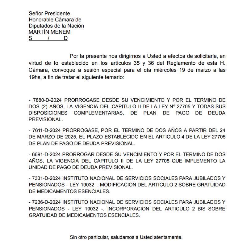 Además, el bloque de Unión para la Patria le solicitó formalmente al presidente de la Cámara de Diputados, Martín Menem, que convoque a una sesión especial para tratar un temario centrado en propuestas para jubilados y pensionados. En la carta dirigida a Menem, los diputados justicialistas pidieron que se incluya en la sesión del miércoles 19 de marzo la prórroga de la vigencia del Capítulo II de la Ley 27.705, que implementó el Plan de Pago de Deuda Previsional, así como modificaciones a la Ley 19.032 para garantizar la gratuidad de medicamentos esenciales para jubilados.