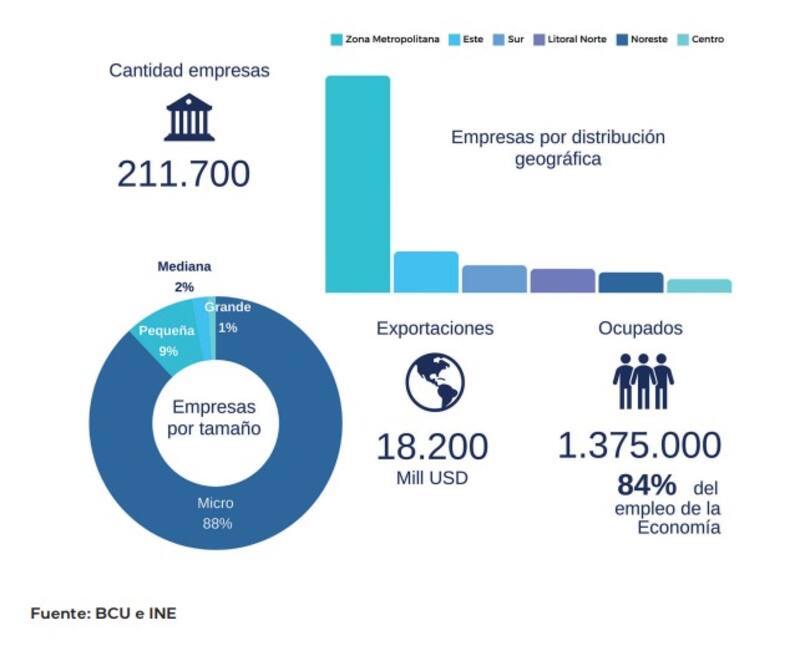 Acorde al directorio de entidades jurídicas privadas del Instituto Nacional de Estadísticas (INE), figuran 211.700 empresas privadas, de las cuales el 88% son micro (menos de 5 trabajadores), el 9% son pequeñas (entre 5 y 19 trabajadores), el 2% son medianas (entre 20 y 99 trabajadores) y el 1% grandes (100 o más trabajadores). El 63% de las empresas se encuentran ubicadas en la zona metropolitana, que es el territorio político del Frente Amplio, seguido por la región este (12%) y sur (8%).