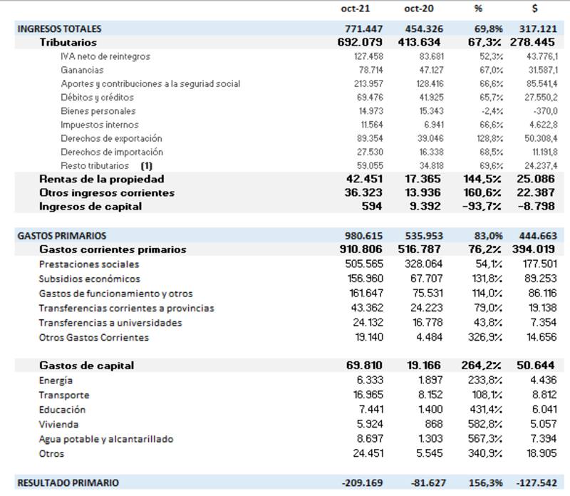 En tanto, el gasto primario registró en octubre una suba de 83% i.a. (20,3% real), que asciende a 96,9% (29,5% real) si se excluyen las erogaciones relacionadas con el combate de los efectos económicos y sociales de la Covid-19 en 2020 y 2021.
