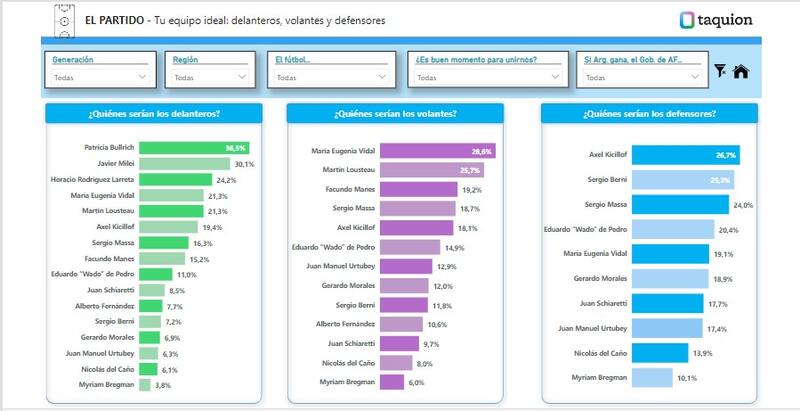 En volantes ganó Vidal, con 28,6%; Lousteau con 25,7; Facundo Manes con 19,2, Massa con 18,7 y quinto aparece Kicillof con 18,1. El gobernador bonaerense ganó en la opción de defensores donde el podio es exclusivamente del Frente de Todos. Kicillof se quedó con el 26,7%; Sergio Berni con 25,3; Massa 24 y el ministro del Interior, Eduardo ‘Wado' de Pedro tuvo 20,4. Los porcentajes dan más de 100 porque había que formar el equipo ideal de 11 jugadores más el DT.