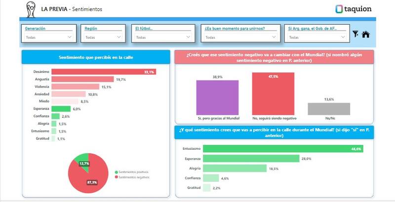 Justamente sobre esa expectativa se había centrado el último estudio de Taquion que recogió respuestas positivas respecto al Mundial de Fútbol a jugarse en Qatar. Los datos no son buenas noticias para la política. Si bien el 46,6% cree que habrá entusiasmo durante el próximo mes, el 28% esperanza, el 18,5 alegría y el 4,6 confianza, esas sensaciones no se trasladan a la gestión de gobierno. Son sólo sentimientos para el campo de juego y el fútbol.