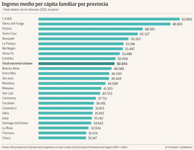 El Observatorio de la Deuda Social de la Universidad Católica Argentina (UCA) acaba de emitir un informe titulado "Desigualdades provinciales en la distribución de ingresos. Tercer trimestre 2022, EPH- total Urbano" en el que se exponen notables disparidades existentes entre las provincias de la Argentina en lo que respecta a sus medias de ingresos, tanto individuales como a nivel del hogar.
