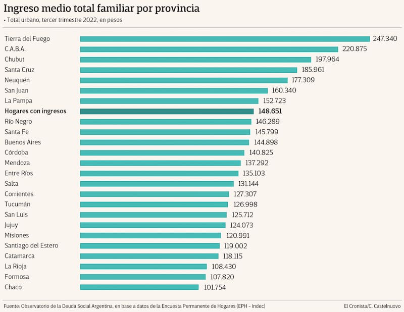 Así, en el mapeo inicial que expuso este relevamiento se pudo percibir que las provincias de la Patagonia como Santa Cruz, Tierra del Fuego, Chubut y Neuquén, junto con la Ciudad de Buenos Aires, San Juan y La Pampa cuentan con ingresos medios por familia que van de los $ 247.000 mensuales a los $ 152.000.