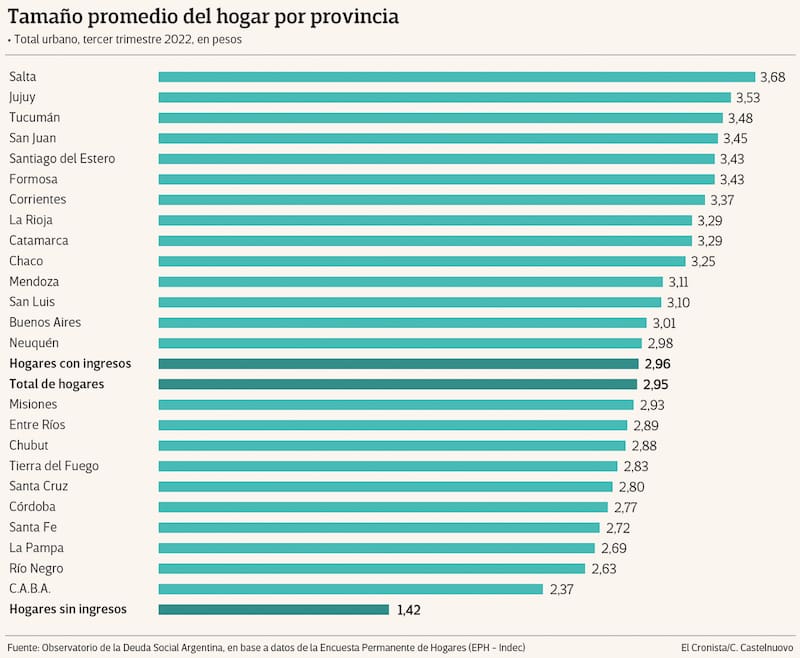 ¿Cómo están conformados los hogares que reciben ingresos? En el Total urbano nacionalel tamaño promedio de los hogares urbanos es de 2,95 personas.Así, la Ciudad de Buenos Aires posee los hogares urbanos más pequeños en tamaño, con 2,37 personas promedio por unidad doméstica, distanciándose significativamente del resto de las áreas geográficas. Salta y Jujuy son las provincias que evidencian los hogares más numerosos, con 3,68 y 3,56 personas promedio por hogar.