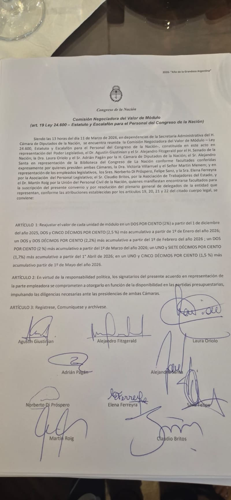 La Comisión Negociadora del Valor del Módulo acordó este miércoles un incremento escalonado de casi 10% para todos los trabajadores: un 2% retroactivo a diciembre del 2025, más acumulativos de 2,5% en enero, 2,2% en febrero, 2% en marzo, 1,7% en abril y 1,5% en mayo del 2026. Este lleva las firmas de las autoridades de ambas cámaras y los secretarios generales de la Asociación del Personal Legislativo (APL), ATE Congreso y UPCN Congreso.