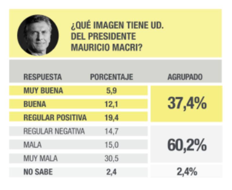 Consultados acerca de la imagen que tienen de Macri, 60,2% de los encuestados se inclinó por respuestas negativas (regular negativa, 14,7%; mala 15%; muy mala 30,5%), mientras que un 37,4% por positivas (muy buena, 5,9%; buena 12,1%; regular positiva 19,4%).