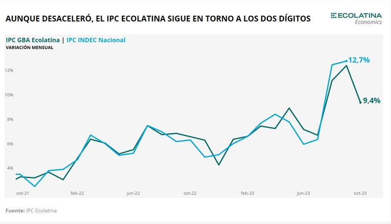Para Ecolatina, en el Gran Buenos Aires (GBA) el Índice de Precios al Consumidor (IPC) registró una suba del 9,4% respecto a septiembre, mes que había marcando el máximo nivel de la serie histórica su medición (12,4%). "De este modo, nuestro índice acumuló un alza del 122,3% en lo que va del año y 146,3% en la comparación interanual. Los congelamientos aplicados a las tarifas de servicios públicos (energía, transporte), combustibles y tipo de cambio oficial, junto con los acuerdos de precios, fueron clave para evitar que la inflación volviera a superar el 10%", postuló la consultora.