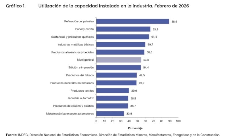 El Instituto Nacional de Estadística y Censos (INDEC) dio a conocer este viernes el uso de la capacidad instalada de febrero, que se ubicó en 54,6%, nivel inferior al del mismo mes de 2025, que fue de 58,6%.