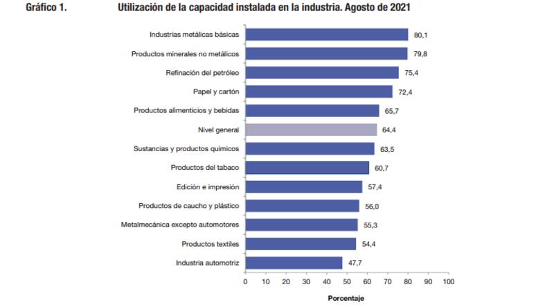 La utilización de la capacidad industrial (UCI) se ubicó en agosto en 64,4%, nivel superior al del mismo mes de 2020, en el que se registró un 58,4%.