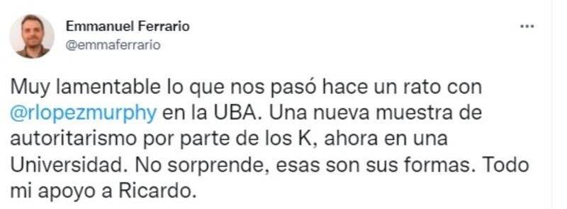 El diputado de la Ciudad de Buenos Aires, Emmanuel Ferrario, también usó su perfil de Twitter para cuestionar lo ocurrido en la UBA. "Muy lamentable lo que pasó hace un rato con Ricardo López Murphy", remarcó.