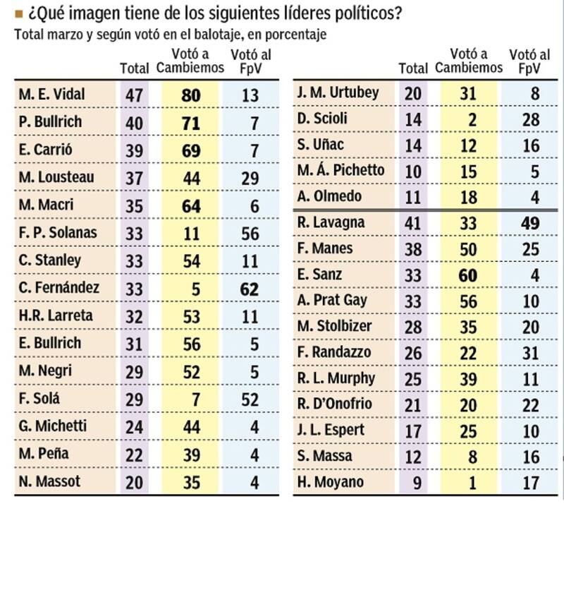 En ese cuadro, mientras el presidente Mauricio Macri muestra una imagen positiva de solo 35 puntos (58% de negativa) y su antecesora Cristina Kirchner se mantiene en 33% (62% negativa), se destaca el descenso del ex ministro de Economía Roberto Lavagna, luego de su irrupción en la escena política como potencial candidato a la Jefatura de Estado.