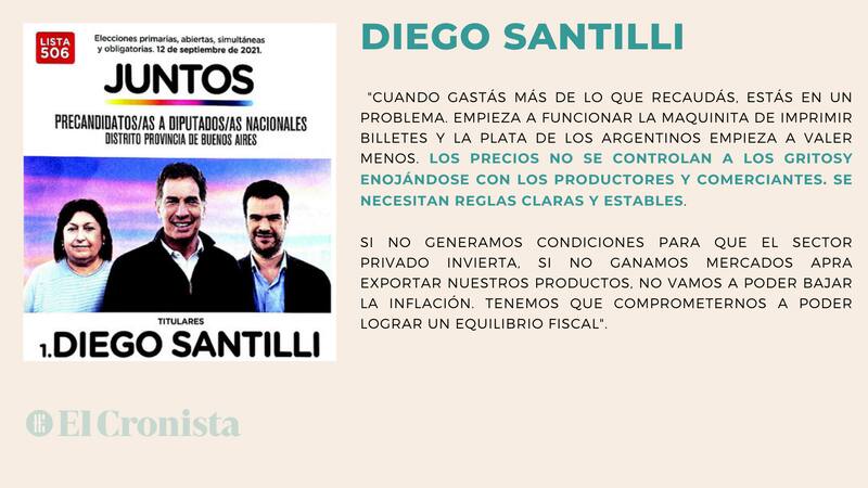 "Cuando gastás más de lo que recaudás, estás en un problema. Empieza a funcionar la maquinita de imprimir billetes y la plata de los argentinos empieza a valer menos. Los precios no se controlan a los gritos y enojándose con los productores y comerciantes. Se necesitan reglas claras y estables", sostuvo Santilli.