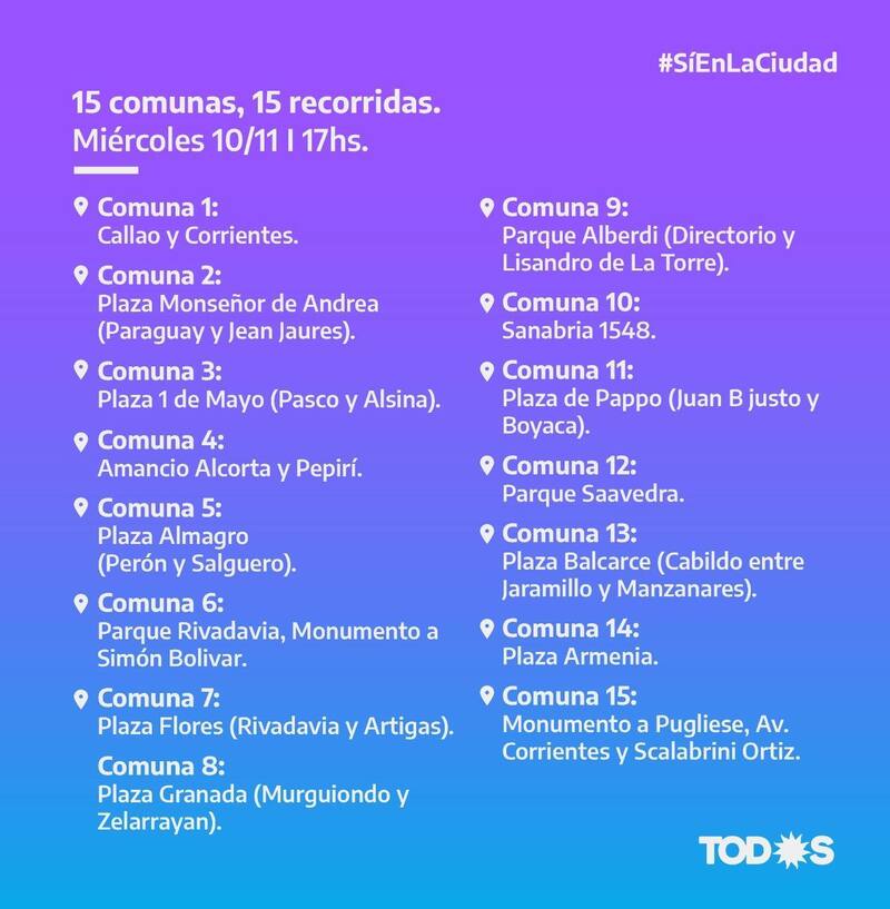 Con la consigna "15 comunas, 15 recorridas", se encontrarán en distintas plazas de la Ciudad y saldrán a caminar por los barrios para escuchar a los vecinos, acercarles las propuestas del espacio y la boleta del Frente de Todos para el próximo domingo.