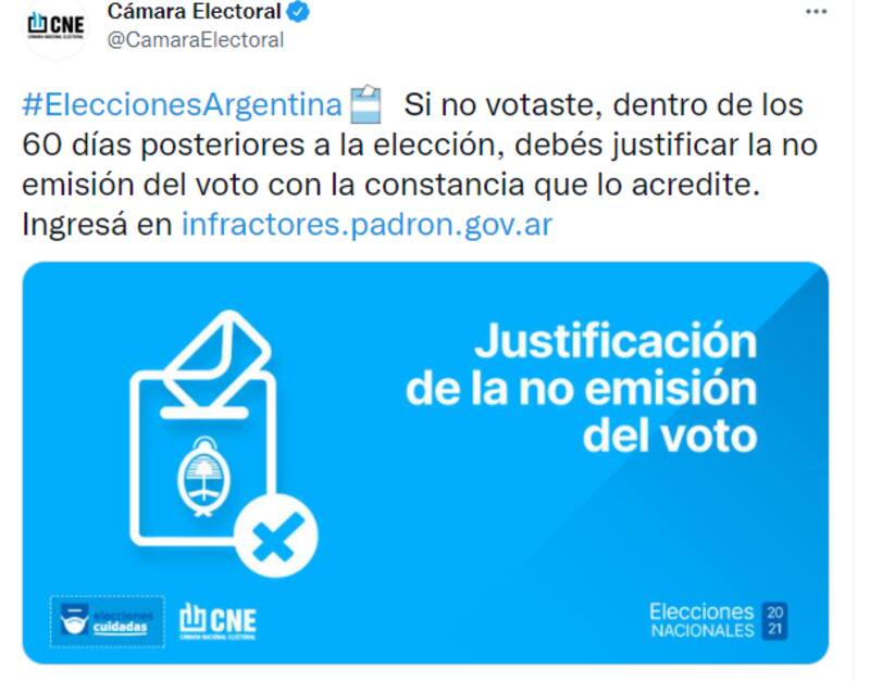 "Si no votaste, dentro de los 60 días posteriores a la elección, debés justificar la no emisión del voto con la constancia que lo acredite", señaló la Cámara Nacional Electorala través de redes sociales.