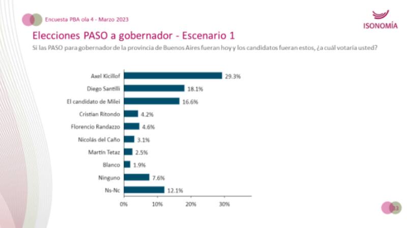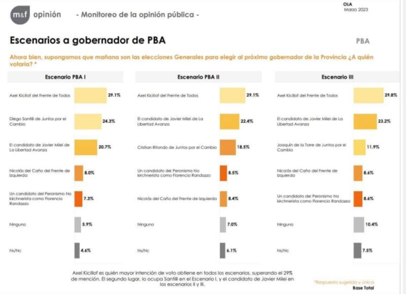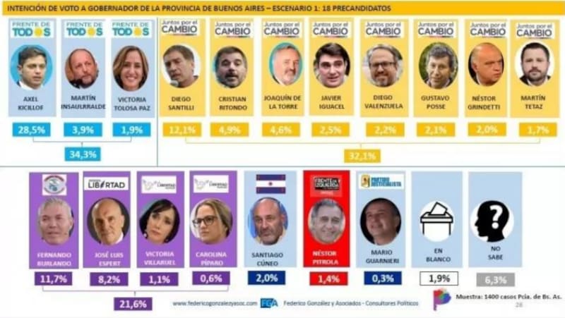 En los cuatro estudios el candidato más votado es Kicillof individualmente, mientras que segundo quedaría Diego Santilli, de Juntos por el Cambio. Otras opciones que también fueron relevadas en la oposición fueron Joaquín de la Torre, Cristian Ritondo y Facundo Manes, mientras que en el FdT también podría participar de las listas Martín Insaurralde.