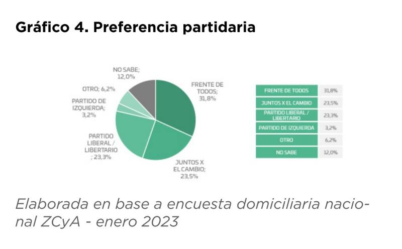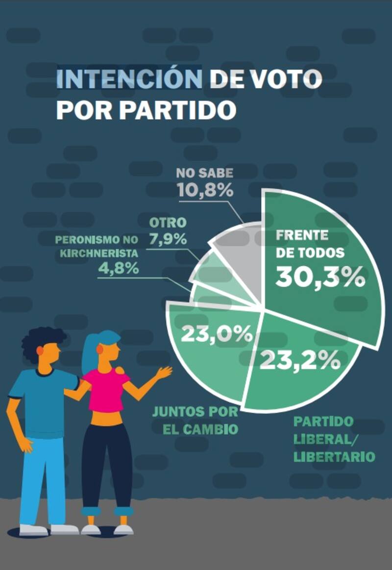 Entre los jóvenes, la intención de voto por partido, arroja que el FdT logra 30, 3%, el libertario 23,2% y Juntos por el Cambio 23.
