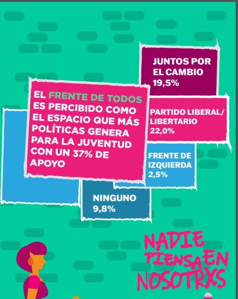 Sin embargo, frente a la consulta sobre qué espacio muestra más "incapacidad" para escuchar a las juventudes, el FdT está segundo con un 26,1%, detrás de Juntos por el Cambio, que es castigado con un 34,9%