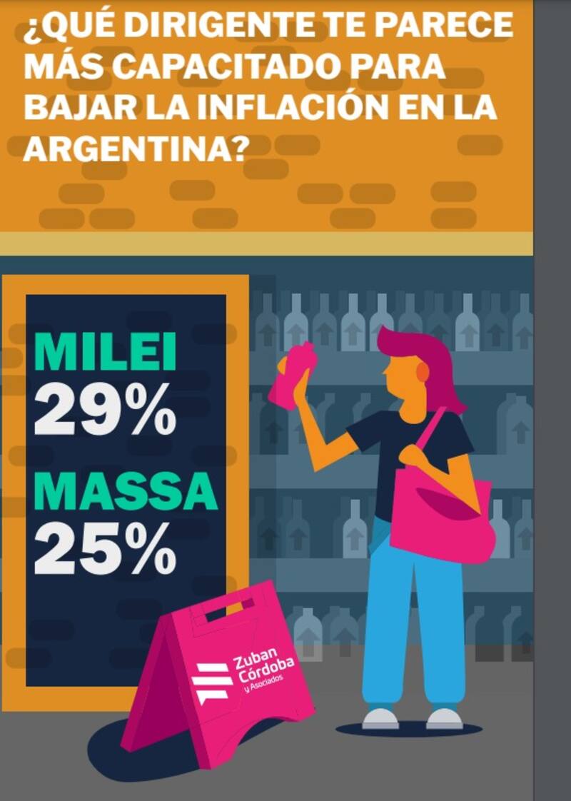 La prueba es que el rating de Javier Milei mejora cuando se pone a la juventud delante de su figura en términos individuales: el economista y diputado es percibido como el más capacitado para bajar la inflación en el país, con un 29% de apoyo. Detrás y cerca aparece Sergio Massa, con un 25%.