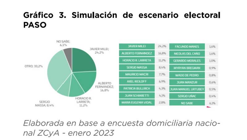En materia de intención de voto "el panorama electoral aún está muy abierto respecto a qué harán la juventudes. Javier Milei aparece como principal favorito dentro del escenario PASO ( 24,2%) a nivel individual pero contra la sumatoria de candidatos de un mismo espacio queda relegado frente a los del FdT (con Alberto Fernández, Sergio Massa, Axel Kicillof, Wado de Pedro, Juan Manzur) que superan al libertario, sumados, por 31,8 contra 23,3, al igual que lo hacen los de Juntos por el Cambio (JxC) quien al sumar a Horacio Rodríguez Larreta, Mauricio Macri, Patricia Bullrich, María Eugenia Vidal y Facundo Manes, consiguen 23,5.