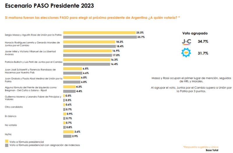 En este estudio el economista se ubica primero a nivel individual, pero continúa tercero en cuanto a agrupaciones políticas con La Libertad Avanza, ya que tanto JxC como UxP tienen internas y pueden sumar los porcentajes de las distintas corrientes.