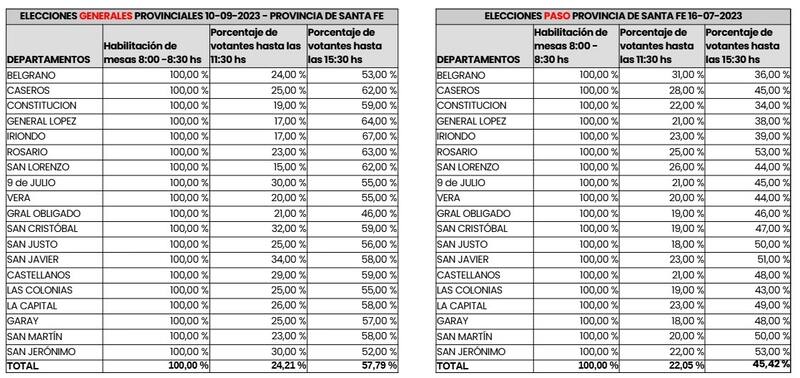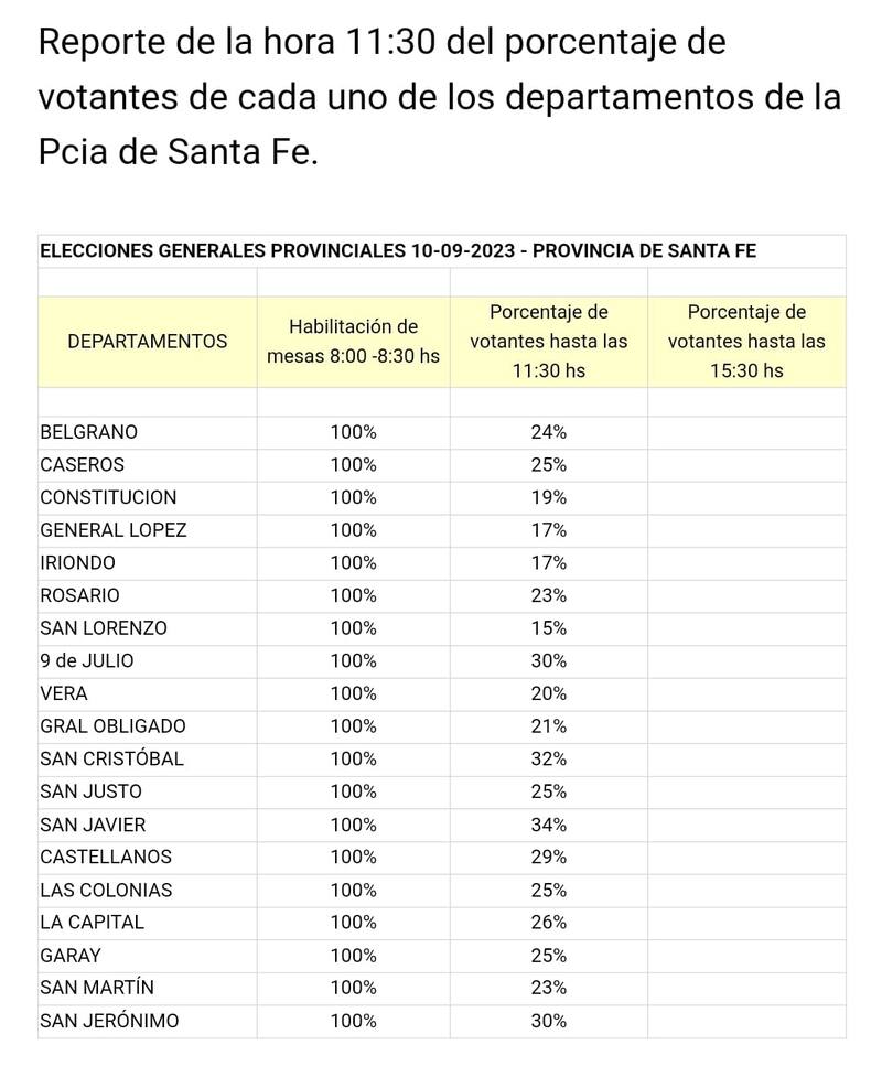 Según el último corte realizado a las 15.30, en las elecciones generales que se celebran hoy en toda la provincia de Santa Fe, a esa hora ya había votado el 57,79% del padrón, informó la Secretaría Electoral provincial. Se trata de una suba significativa de la participacion electoral respecto de las PASO del 17 de julio pasado, ya que en esa instancia, a esa misma hora, la participación era de 45,42%.