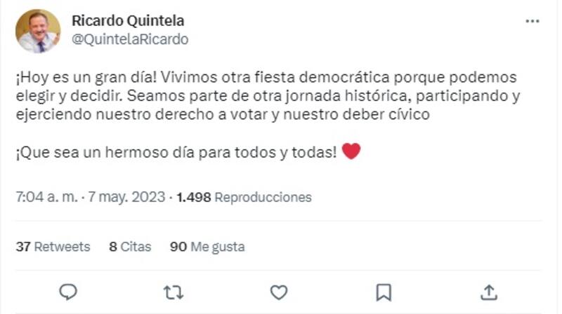 "¡Hoy es un gran día! Vivimos otra fiesta democrática porque podemos elegir y decidir. Seamos parte de otra jornada histórica, participando y ejerciendo nuestro derecho a votar y nuestro deber cívico.