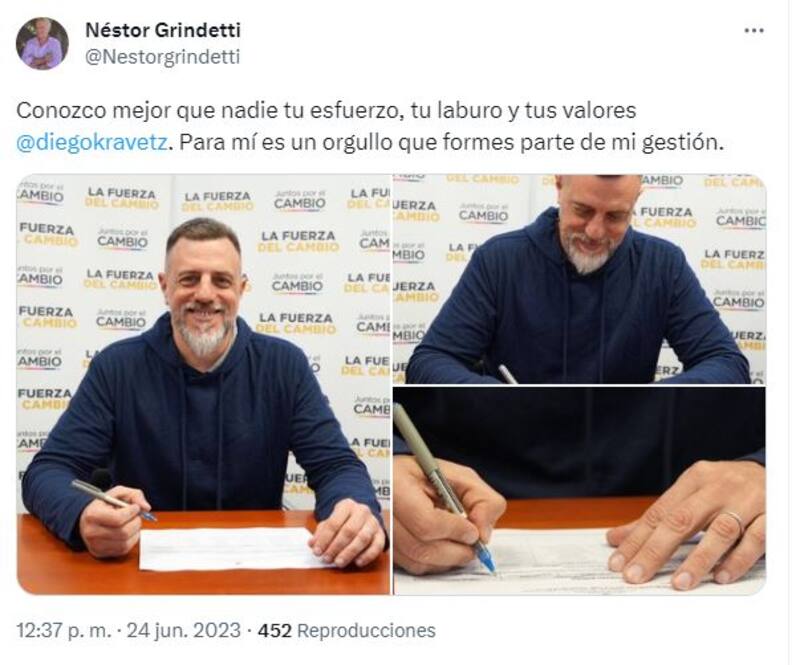 Se trata del actual jefe de Gabinete Diego Kravetz. "Conozco mejor que nadie tu esfuerzo, tu laburo y tus valores. Para mí es un orgullo que formes parte de mi gestión", escribió en Twitter el candidato que apoya Patricia Bullrich en la interna.