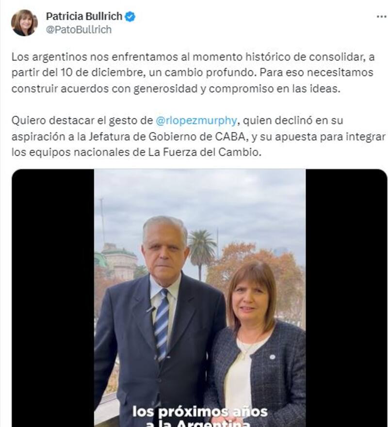 "Quiero destacar el gesto de Ricardo López Murphy, quien declinó en su aspiración a la Jefatura de Gobierno de CABA, y su apuesta para integrar los equipos nacionales de La Fuerza del Cambio", escribió en su Twitter.
