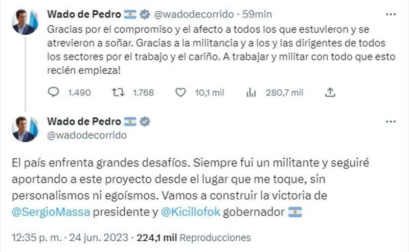 El ministro del Interior Eduardo "Wado" de Pedro, que hasta pocas horas atrás era el precandidato presidencial de Unión por la Patria, rompió el silencio tras la confirmación de la fórmula con Sergio Massa al frente.