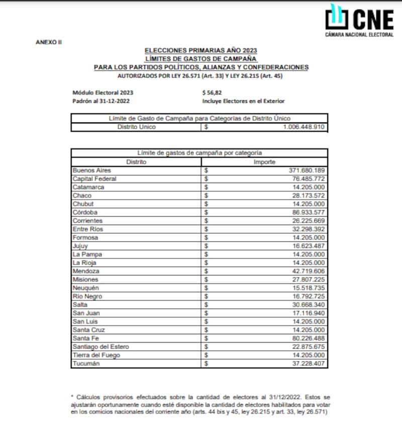 Los limites de gastos de campaña según la Cámara Nacional Electoral son los siguientes: