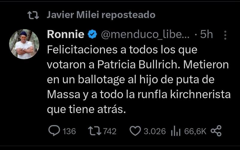 Minutos después de enviar guiños a Juntos por el Cambio para captar los votos de Bullrich, el libertario retuiteó un mensaje que apuntaba directamente contra esos votantes. En tono irónico, el usuario escribió: "Felicitaciones a todos los que votaron a Bullrich. Metieron en un ballotage al hijo de puta de Massa y toda la runfla kirchnerista que tiene atrás.