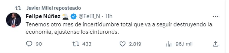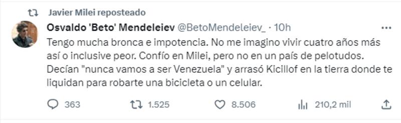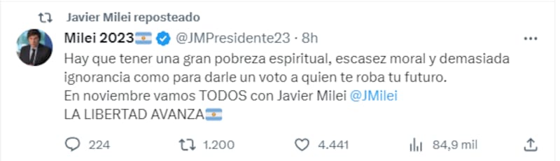 Si bien Milei no escribió directamente un mensaje de su autoría luego de conocerse los resultados, sí retuiteó varios mensajes de apoyo a su candidatura de cara a la segunda vuelta que ocurrirá en 28 días. Sin embargo, algunos eran bastante subidos de tono con el electorado, que puso a Massa en primer lugar y reeligió a Axel Kicillof en la provincia de Buenos Aires.