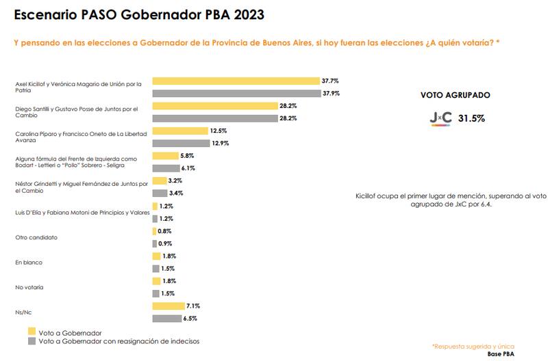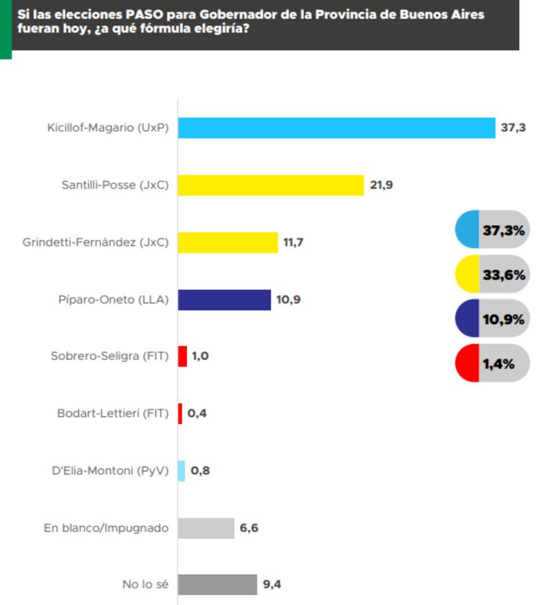 En este estudio los dos candidatos de la coalición opositora reunirían 37,3% de los votos frente a los 32,5 de Axel Kicillof, lo que marcaría una dura derrota del oficialismo en la Provincia de Buenos Aires e impulsaría también a los candidatos a nivel nacional.