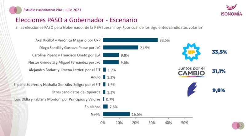 En el informe de julio de Isonomía se da el panorama un poco más favorable para JxC: estarían a tan solo dos puntos del oficialismo si se suman ambas fuerzas internas. Lo que se repite es la baja cantidad de votos que logra Grindetti con tan solo 9,6%, por atrás de LLA.
