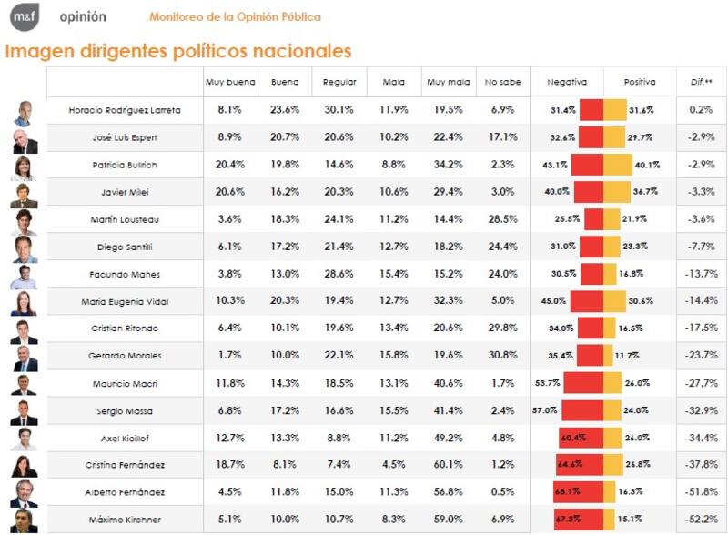 Si se ordena por imagen positiva, encabezan el listado Patricia Bullrich (40,1%) y Javier Milei (36,7%), aunque ambos tienen diferenciales negativos.