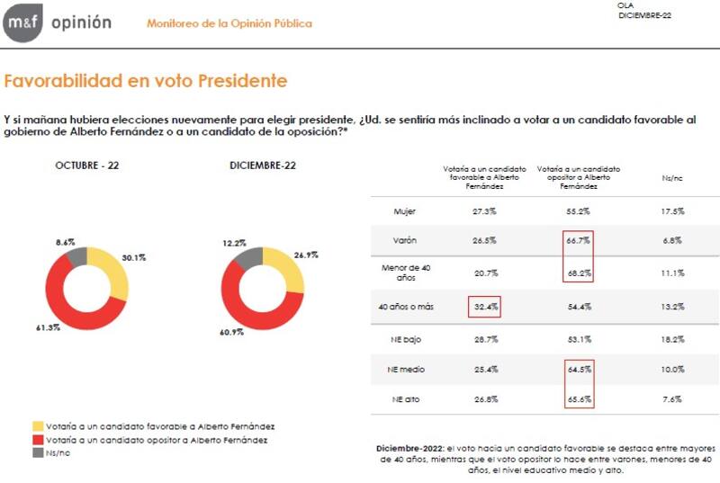 Luego, de lleno en la cuestión electoral, el Frente de Todos parece seguir complicado. Solo un 26,9% se inclinaría a votar a un candidato oficialista en las próximas elecciones presidenciales, por debajo del 30,1% de la medición anterior. Igualmente, también bajan los que creen que votarían por un candidato opositor: pasaron del 61,3% al 60,9%. En el medio, los que aumentaron son los indecisos.