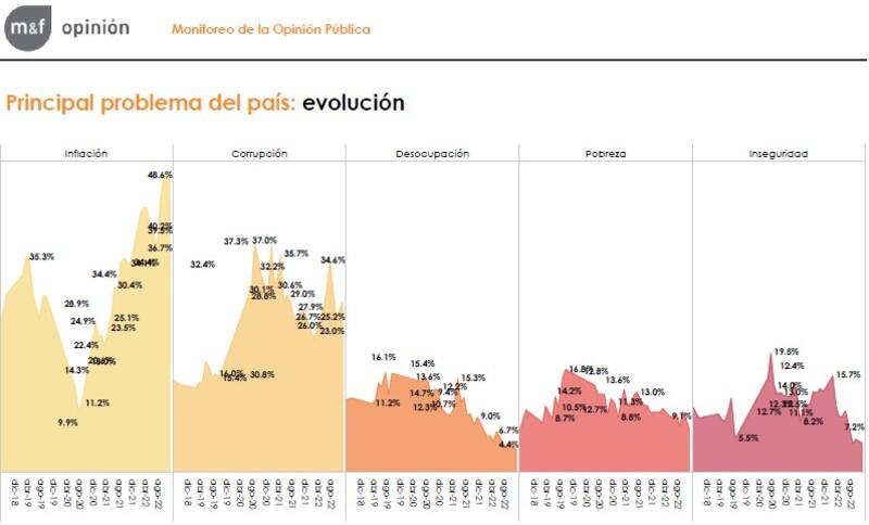 Respecto a los principales problemas del país, hay uno que se sigue llevando todos los flashes: la inflación. Fue mencionado por el 48,6% de los consultados, similar al anterior relevamiento. Luego, lejos, aparece la corrupción (27,9%). Completan el top 5 de preocupaciones tres temas que están en baja: pobreza (7,2%), inseguridad (4,7%) y desocupación (3,5%).