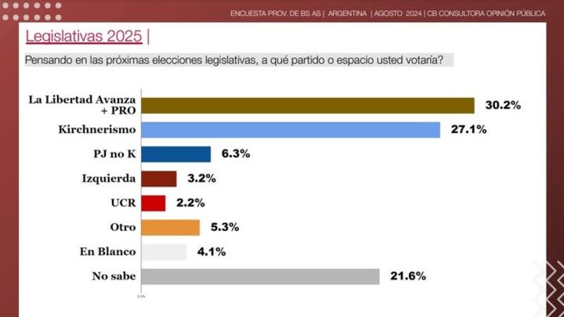 Tercero se ubica un peronismo no kirchnerista aparecería con 6,3%, dato que podría ser significativo si Kicillof logra encolumnar al peronismo disidente bajo su ala.