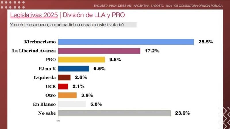 En caso de no ir juntos, en este escenario el kirchnerismo arrasaría con la votación con un 28,5% de los encuestados votando la lista de Kicillof. Mientras que los libertarios quedarían en segundo lugar con un 17,2% y el PRO en un 9,8%.