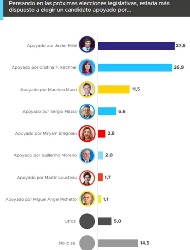 En este sentido, también sería Javier Milei sería quién en caso de elegir candidato a las legislativas tendría la mayor cantidad de apoyo con 27,8%.