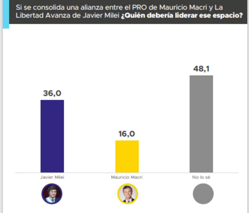 Según la encuesta, 36,0% de los encuestados determinó que en caso de una futura alianza entre ambos espacios debería ser el presidente Javier Milei quién encabezara dicha coalición.