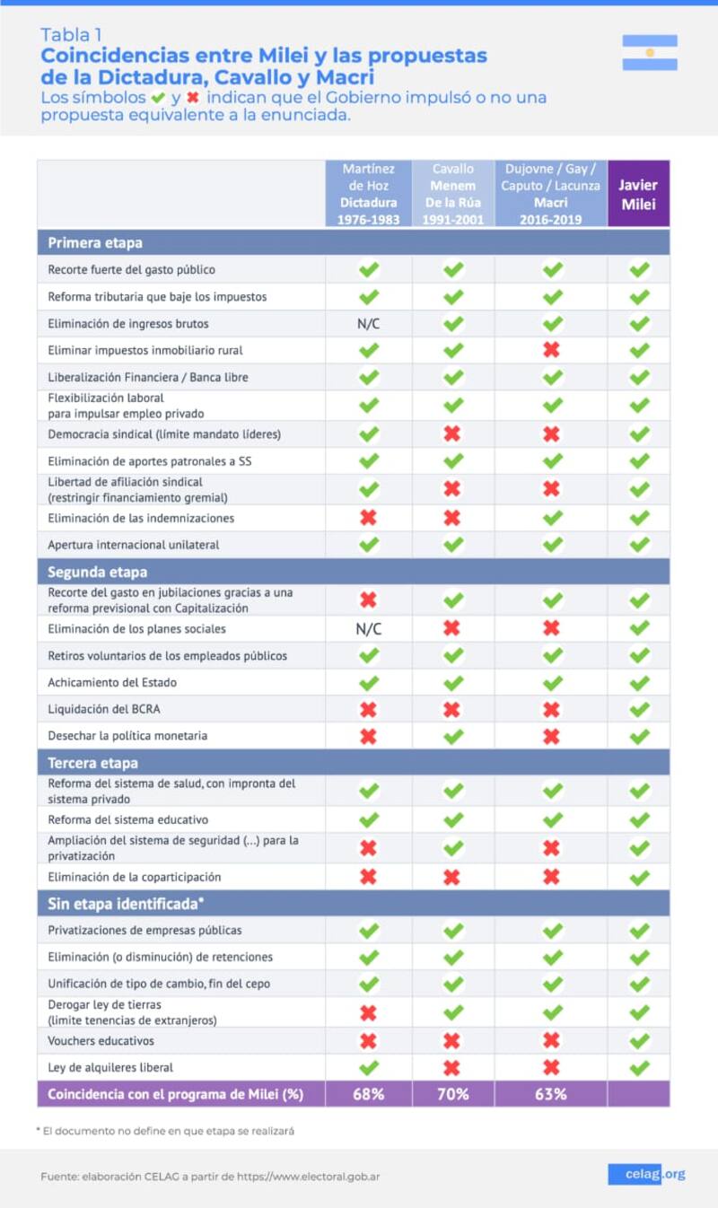Por otro lado, el informe también destacó que el programa económico de Milei coincide en un 70 % con la política económica impulsada por Cavallo, Menem y De la Rúa, y tiene un 68 % de similitudes con el programa que puso en funcionamiento Martínez de Hoz durante la dictadura.