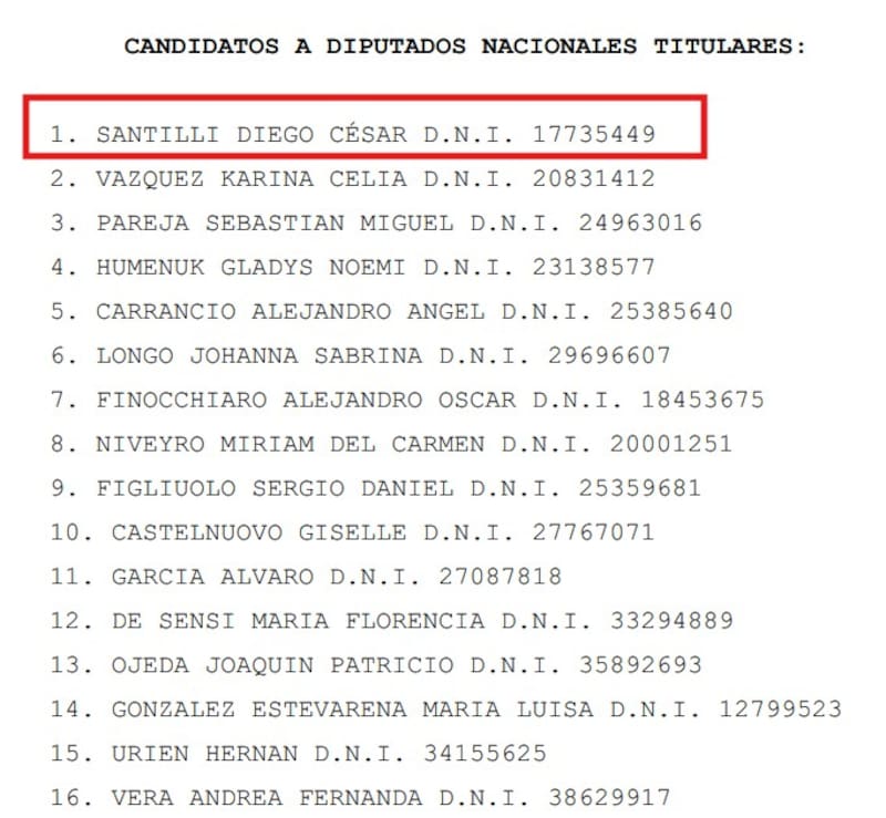 La nueva lista ubica a Santilli en el primer lugar, seguido por Karen Reichardt (Karina Vázquez), Sebastián Pareja (el presidente de LLA en la Provincia) y Gladys Humenuk (referente del karinismo), manteniendo la alternancia entre géneros. Entre los suplentes, el primer lugar corresponde a María Soledad Poso.