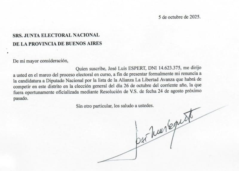 Un día después de conocerse en redes, los apoderados de La Libertad Avanza (LLA) presentaron ante la Junta Electoral Nacional de la Provincia de Buenos Aires un escrito en el que informan la renuncia de José Luis Espert a su candidatura como primer diputado nacional por el distrito bonaerense y solicitan el reordenamiento de la lista encabezada por el economista.